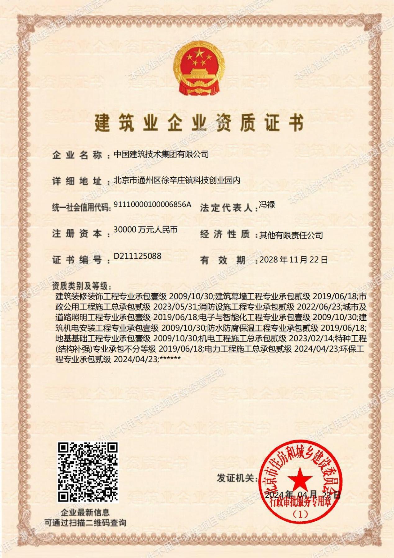 近年來,中國建技致力于完善資質(zhì)平臺建設(shè),形成了覆蓋規(guī)劃、勘察、設(shè)計、施工、監(jiān)理、咨詢、檢測與服務(wù)等領(lǐng)域的全產(chǎn)業(yè)鏈資質(zhì)矩陣。勘察設(shè)計領(lǐng)域,擁有工程勘察專業(yè)類(巖土工程)甲級、建筑行業(yè)(建筑工程)甲級、風景園林工程設(shè)計專項甲級、城鄉(xiāng)規(guī)劃編制甲級、土地規(guī)劃乙級、測繪工程測量乙級、勞務(wù)類(工程鉆探)乙級等多項資質(zhì);工程施工領(lǐng)域,擁有建筑工程施工壹級、市政公用工程貳級、機電工程施工貳級、電力工程施工貳級四項總承包資質(zhì);鋼結(jié)構(gòu)、地基基礎(chǔ)、裝修裝飾、機電安裝、道路照明、電子與智能化等專業(yè)承包壹級資質(zhì);建筑幕墻、消防設(shè)施、防水防腐保溫等專業(yè)承包貳級資質(zhì);工程監(jiān)理領(lǐng)域,具備屋建筑工程監(jiān)理甲級資質(zhì),開創(chuàng)了以科研引領(lǐng)、設(shè)計助力、施工驅(qū)動的一體化經(jīng)營新局面。