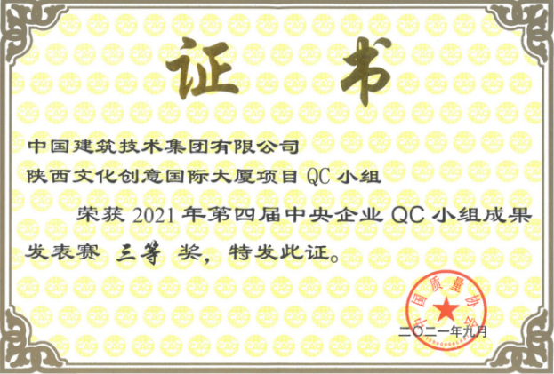 ? 近日,由中國質量協(xié)會主辦的第四屆中央企業(yè)QC小組成果評選發(fā)表賽圓滿結束。中國建筑技術集團有限公司西北分公司憑借陜西文化創(chuàng)意國際大廈項目QC小組《提高疊合板安裝合格率》課題榮獲三等獎。