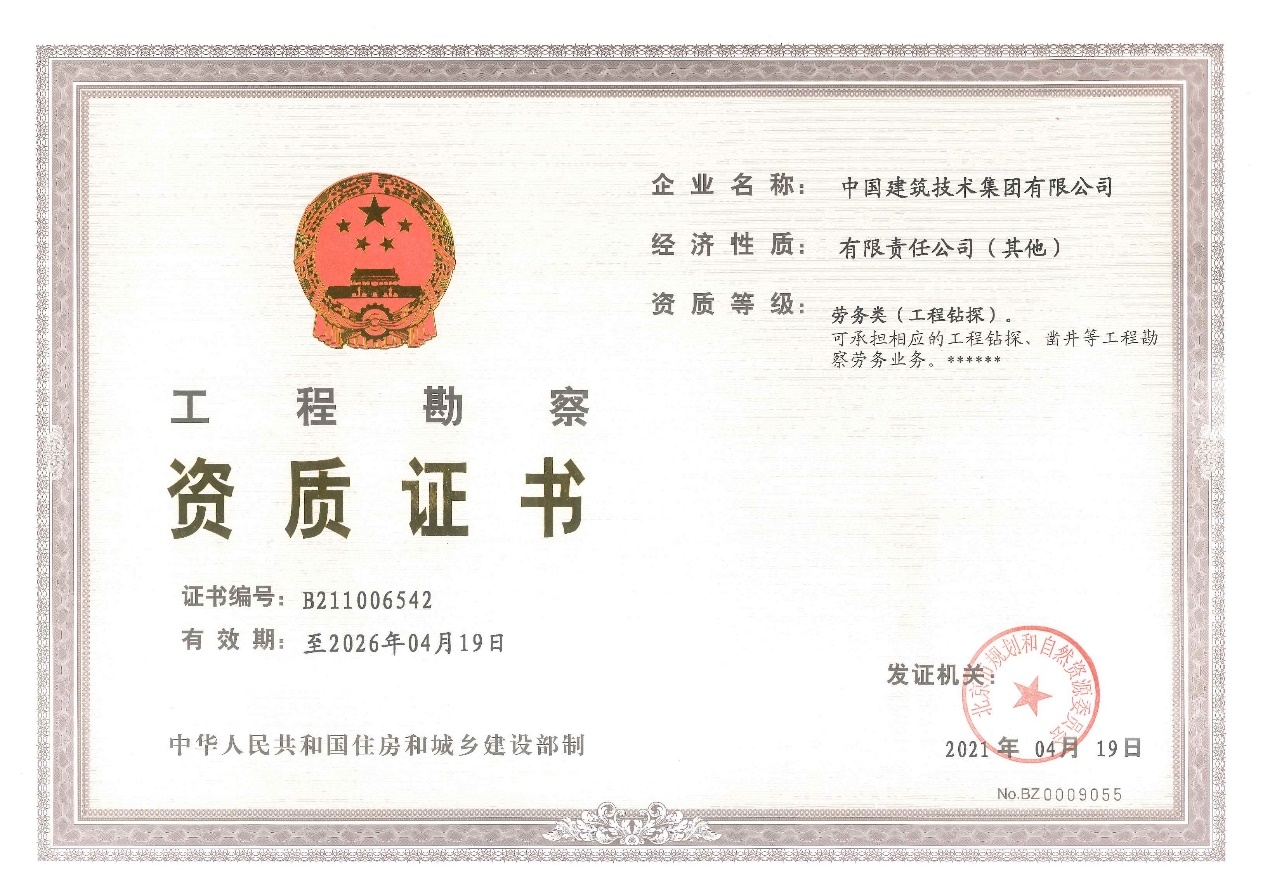 ? ? ? ?4月19日,集團(tuán)公司獲得了北京市規(guī)劃和自然資源委員會頒發(fā)的工程勘察勞務(wù)類(工程鉆探)資質(zhì)證書。