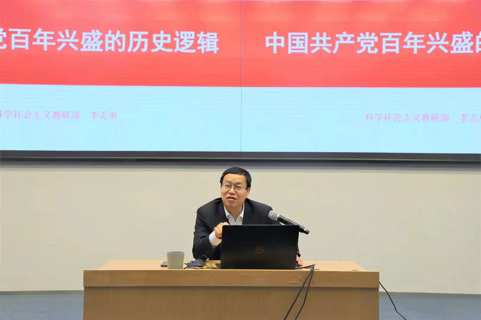 李志勇教授從初心使命、光輝歷程、偉大成就和歷史經(jīng)驗四個方面引導(dǎo)大家一同回顧了中國共產(chǎn)黨成立以來的崢嶸歲月。在對歷史經(jīng)驗的講授中,李教授分別從思想一變天地寬、勇立潮頭敢為先、得民心者得天下、自我革命御風(fēng)險、紅色基因不能變和團結(jié)統(tǒng)一鑄輝煌六個方面,闡明了中國共產(chǎn)黨能夠帶領(lǐng)中國人民從站起來、富起來到強起來的深刻原因,充分論證了中國特色社會主義制度的優(yōu)越性和道路的必然性。