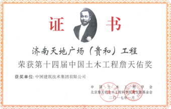 設(shè)計(jì)三所濟(jì)南天地廣場(貴和)項(xiàng)目 榮獲“第十四屆中國土木工程詹天佑獎(jiǎng)”