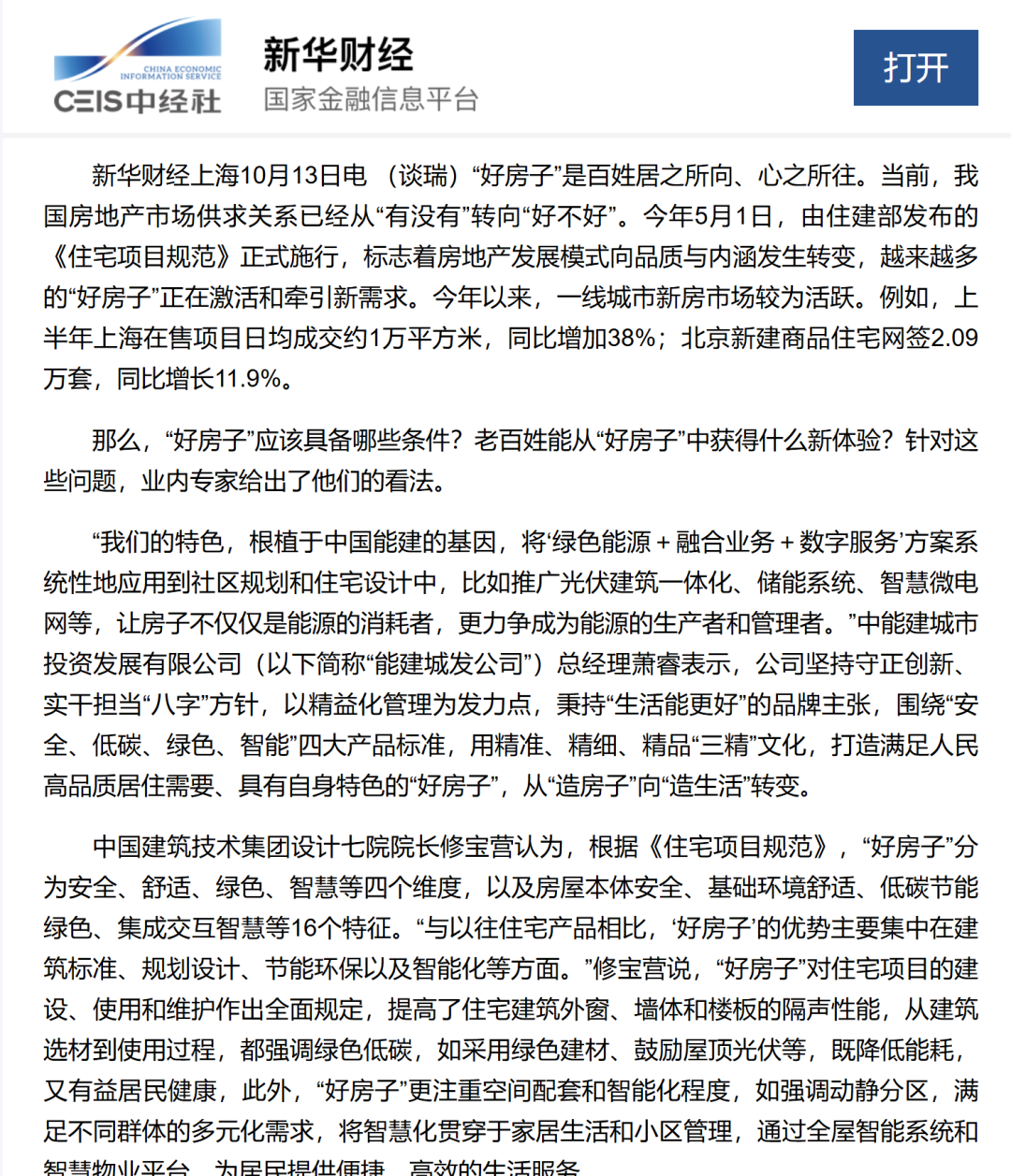 近日,“好房子”建設(shè)成為行業(yè)關(guān)注焦點(diǎn)——中國(guó)建技與中國(guó)能源建設(shè)股份有限公司(以下簡(jiǎn)稱(chēng)“中國(guó)能建”)在“好房子”領(lǐng)域的探索與實(shí)踐,獲新華財(cái)經(jīng)、央廣網(wǎng)、國(guó)資委官網(wǎng)、《中國(guó)證券報(bào)》等主流媒體高頻報(bào)道。多層次、立體化的傳播矩陣不僅讓相關(guān)話題迅速破圈,單條報(bào)道最高閱讀量更突破130萬(wàn),充分彰顯兩家企業(yè)在“好房子”建設(shè)中的行業(yè)引領(lǐng)力,也印證了“好房子”理念與百姓宜居宜業(yè)需求的深度契合。
