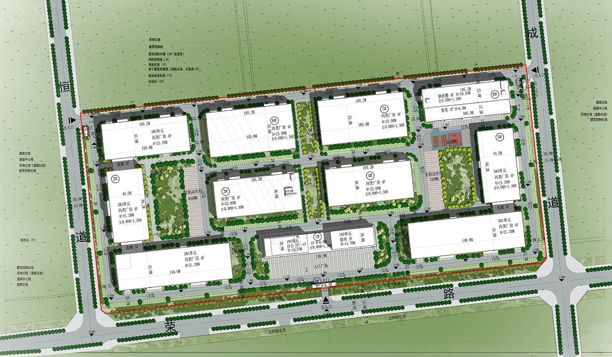 蘆臺農(nóng)業(yè)產(chǎn)業(yè)融合示范基地項目,位于蘆臺經(jīng)濟開發(fā)區(qū)富恒道東側(cè)、榮錦路南側(cè)、富成道西側(cè)、榮昌路北側(cè),是一個集設(shè)計與施工總承包于一體的發(fā)展項目。該項目的用地布局規(guī)整,形狀接近正方形,東西向長約545米,南北向?qū)捈s246米。項目南側(cè)緊鄰榮昌路,規(guī)劃有一條10米寬的城市公園綠地,周邊建筑數(shù)量有限。項目的主要建設(shè)內(nèi)容包括辦公樓、標(biāo)準(zhǔn)廠房、倒班樓、食堂、設(shè)備房、門衛(wèi)管理用房等,共計11棟建筑。其中,包含6棟新建的四層丙類標(biāo)準(zhǔn)廠房、1棟新建的三層辦公樓(局部帶有地下一層)、1棟新建的四層倒班樓(首層設(shè)有食堂)以及3棟單層門衛(wèi)房。此外,新建的附屬配套工程涵蓋了管網(wǎng)工程、道路硬化、綠化工程等。
