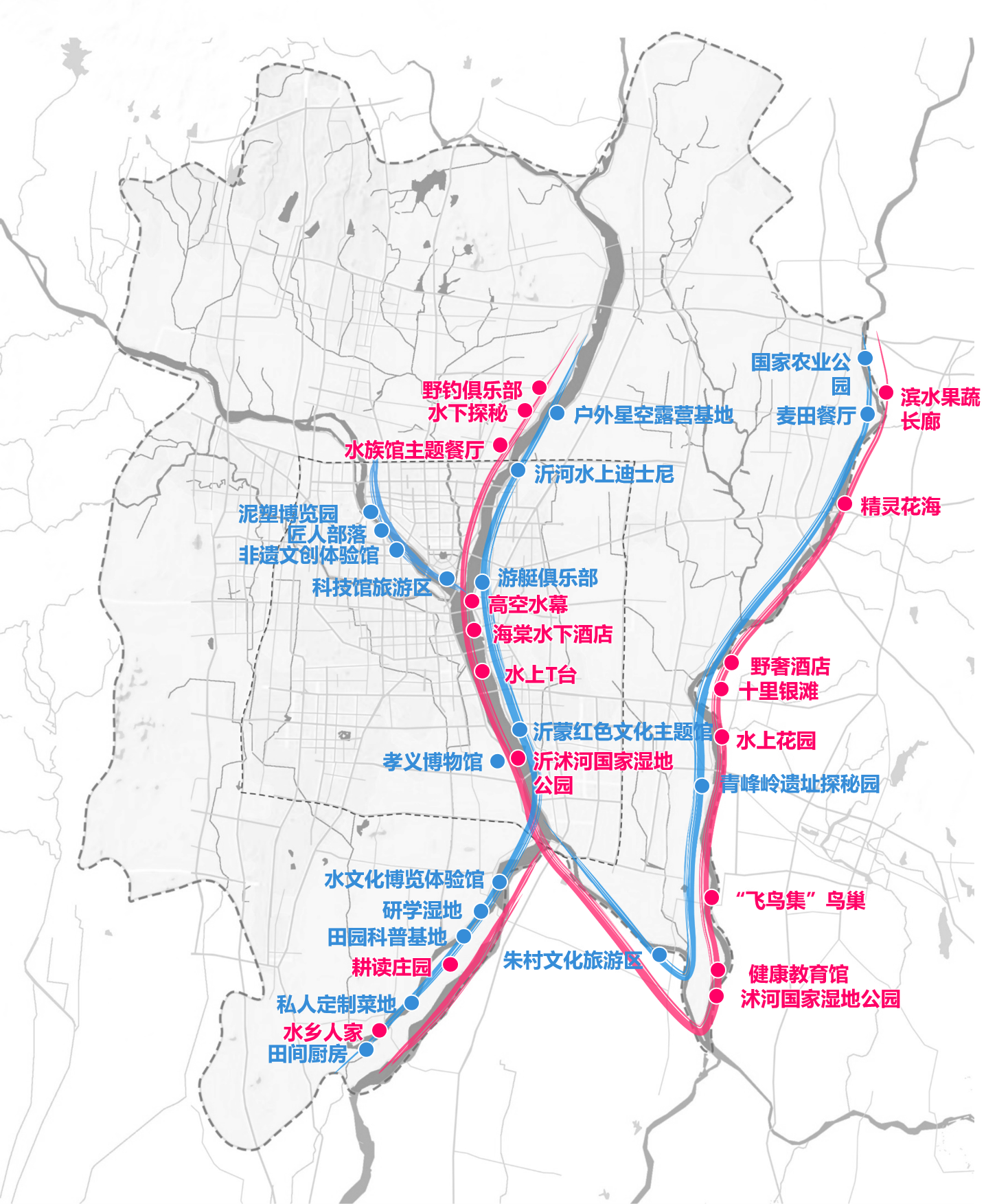 2.“水+旅游”專題——從“河流振興、因水而親、城鄉(xiāng)共榮”的角度出發(fā),通過(guò)對(duì)主要水系河流進(jìn)行發(fā)展定位,完善河流旅游產(chǎn)品和項(xiàng)目業(yè)態(tài),以主題游線設(shè)計(jì)、沂水夜游、其他特色項(xiàng)目等為吸引點(diǎn),優(yōu)化提升臨沂市水上旅游品質(zhì),樹(shù)立臨沂北方水城的品牌形象與市場(chǎng)競(jìng)爭(zhēng)力。