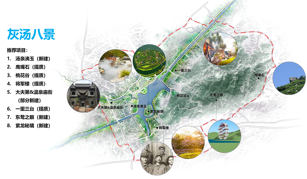 2.1.溫泉保護(hù)與利用:在合理溫泉開發(fā)的基礎(chǔ)上,通過泡溫泉、游溫泉、戲溫泉、吃溫泉、賞溫泉等活動結(jié)合灰湯山水文化、民俗文化、美食文化打造全國溫泉品類最多、體驗(yàn)感最強(qiáng)的溫泉度假區(qū)。