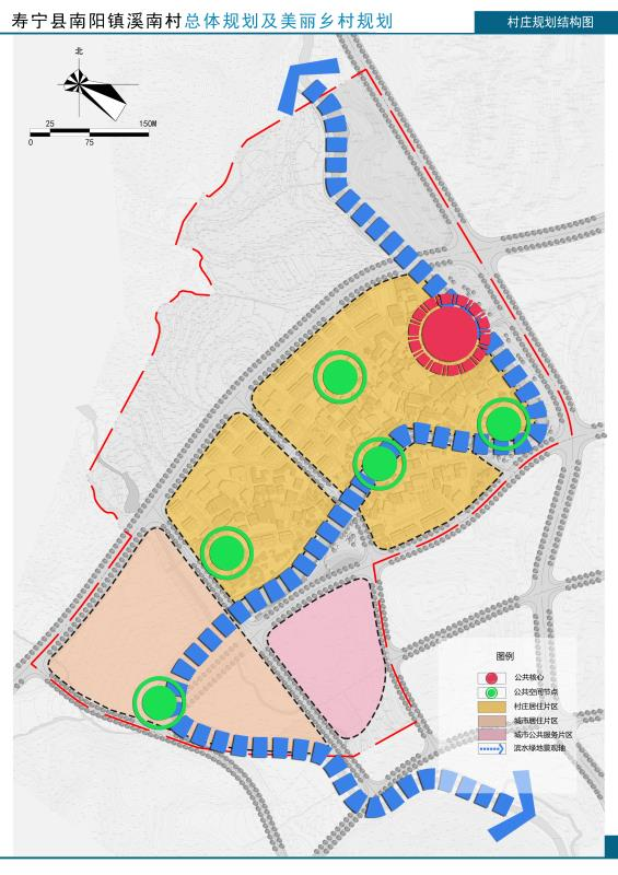 (1)結(jié)構(gòu):村莊建設(shè)發(fā)展區(qū)規(guī)劃形成“一核、一帶、五片、多點(diǎn)”——?一核:以村委、村民文化活動(dòng)公園所形成的公共核心;一帶:沿溪南村傍村而過的溪南溪所形成的濱水綠地景觀帶;五片:①依據(jù)建設(shè)情況劃分成的北部村莊居住片區(qū);②中部村莊居住片區(qū);③南部村莊居住片區(qū)與村;④西南部城市居住片區(qū);⑤城市公共服務(wù)片區(qū)