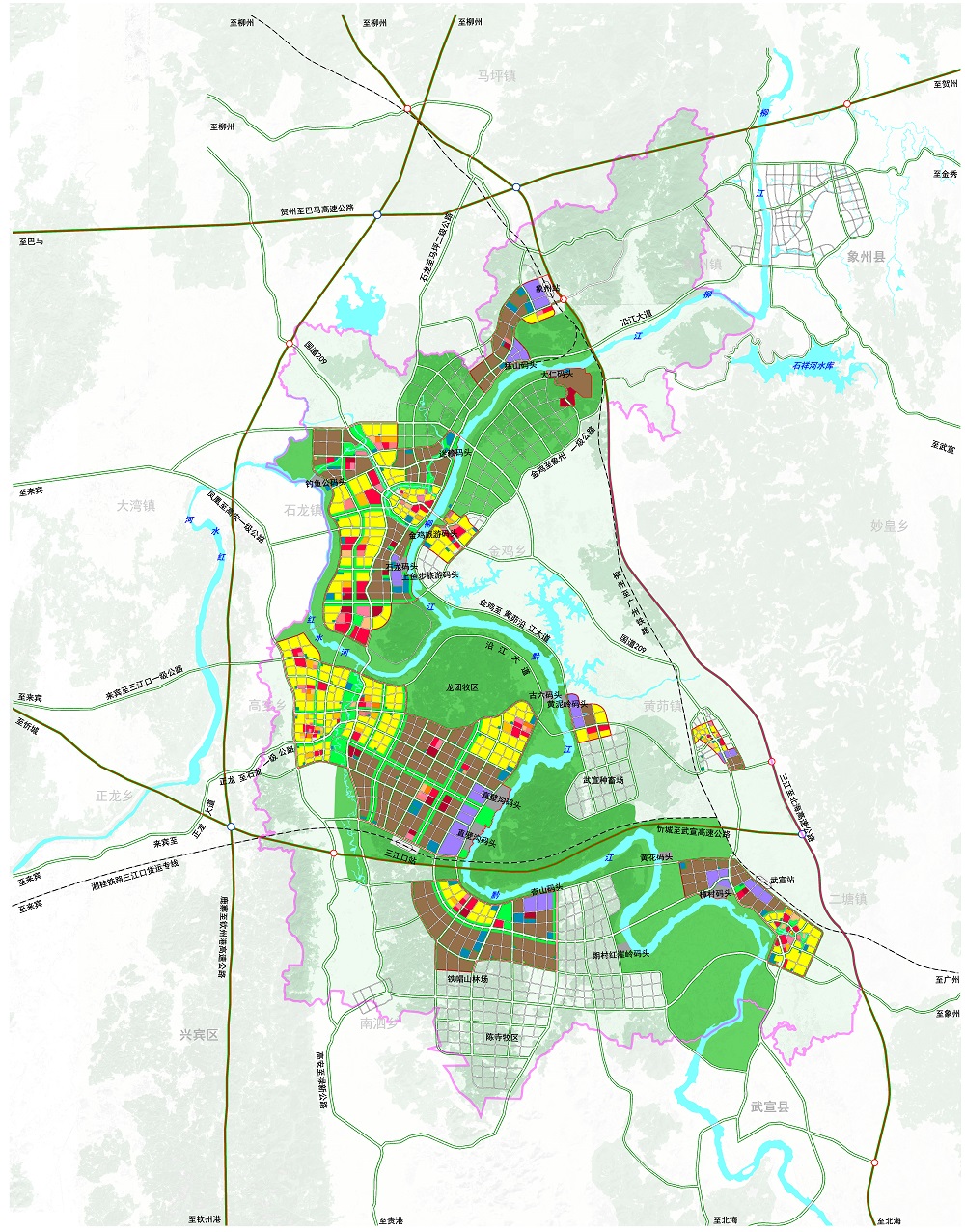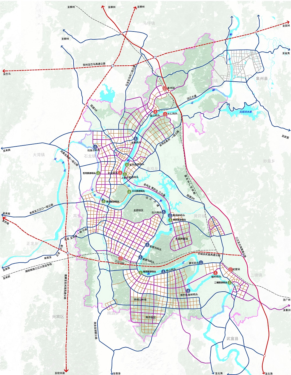 高效綜合交通系統(tǒng)規(guī)劃——以區(qū)域性交通互聯(lián)互通為突破點,形成以港口、鐵路、公路為核心的多式聯(lián)運(yùn)對外綜合交通體系,強(qiáng)化以港口碼頭為中心建設(shè)通往柳州、河池等周邊城市以及通往粵港澳大灣區(qū)城市的黃金水道;重點推進(jìn)三江口新區(qū)產(chǎn)業(yè)組團(tuán)與國道209、國道355等區(qū)域性交通干道的銜接;完善以港區(qū)港口為支點的港產(chǎn)城融合發(fā)展體系:加快石龍碼頭、直壁溝碼頭、黃泥嶺碼頭及其配套設(shè)施的建設(shè),以港口為依托,完善集疏運(yùn)體系,促進(jìn)港口與腹地經(jīng)濟(jì)良性循環(huán)發(fā)展,驅(qū)動新區(qū)從“碼頭經(jīng)濟(jì)”走向港產(chǎn)城融合發(fā)展。