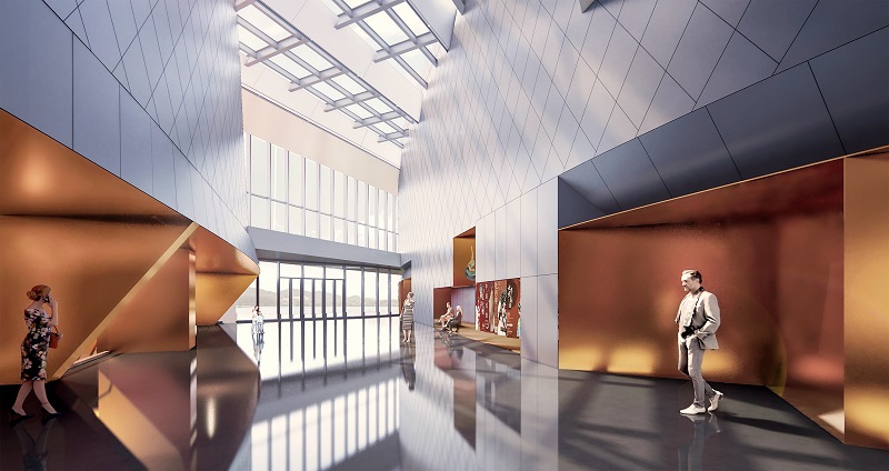 建筑方案以“海上帆、風中翼、云上錦”為總體設計理念,采用“一體兩翼”的規(guī)劃格局,力求以鮮明獨特的建筑形象,充分展現(xiàn)在建設自貿(mào)港這一新時代背景下海南地域文化的“展示與弘揚、傳播與交流、騰飛與發(fā)展”。整體建筑造型如海上揚帆的造型高低錯落呼應,建筑形體面向東側城市廣場開敞,又如張開的親和雙臂,將漫步人群攬入其中,把從西北西南街角引入的城市人群,會聚于建筑中心設有共享、咖啡、新聞發(fā)布等休閑互動區(qū)的“城市文化客廳”,并將建筑空間自然劃分為南北兩翼,即位于北側的瓊劇會館劇場與南側的非遺藝術博物館區(qū),宛如展翅欲飛的“風中雙翼”,迎海上來風。