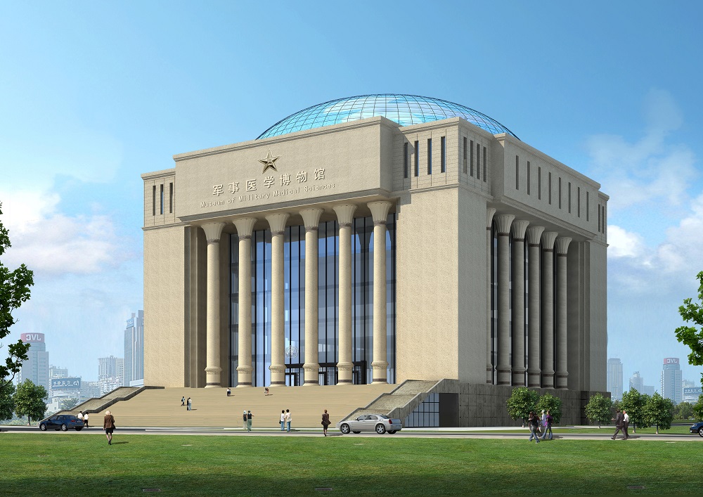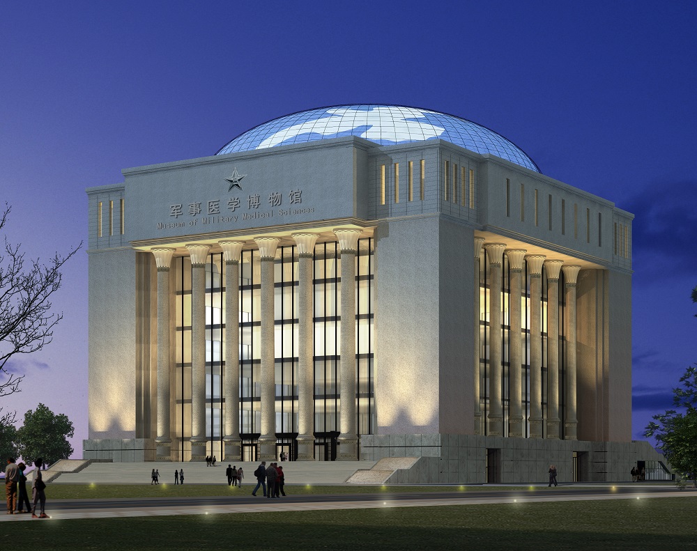 中國人民解放軍軍事醫(yī)學(xué)博物館位于北京市海淀區(qū)太平路,軍事醫(yī)學(xué)研究院內(nèi)西南角,是一座國家級大型軍事醫(yī)學(xué)類博物館。建筑用地0.873公頃,總建筑面積38000平方米。主體建筑方正,頂部圓形玻璃穹頂直徑47米,表達(dá)了天圓地方的中國文化理念。穹頂玻璃幕結(jié)合太陽能技術(shù),部分太陽能反射板組成和平鴿圖案,寓意世界和平,表達(dá)了設(shè)計(jì)的主題。
